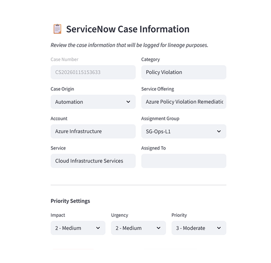 The system generates a pre-filled ServiceNow case linking the policy violation to the proposed fix. This ensures traceability and supports organizations with formal change‑management obligations.