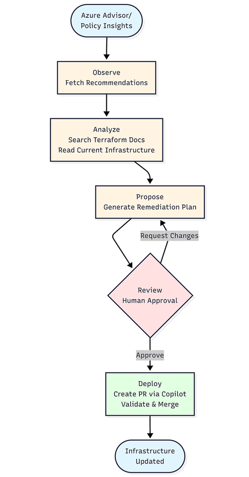 Each recommendation requires the same sequence of manual steps: research, validate the current state, write Terraform changes, test them, create a PR, wait for review, and deploy. Multiply this by dozens or hundreds of issues and you get a backlog that grows faster than your team can work through it. Meanwhile, high‑severity gaps, like unencrypted storage accounts or misconfigured Key Vaults, risk going unresolved for far too long.
