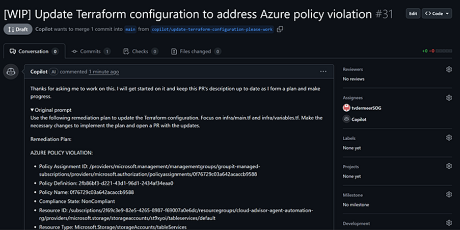 With the plan approved and change case created, you click to generate the pull request. Behind the scenes, the system calls GitHub Copilot’s PR creation API, passing it the remediation plan. The Copilot coding agent spins up a sandbox environment, checks out your repository, reads the Terraform files, makes the necessary edits based on the plan, runs terraform validate, and creates a pull request.